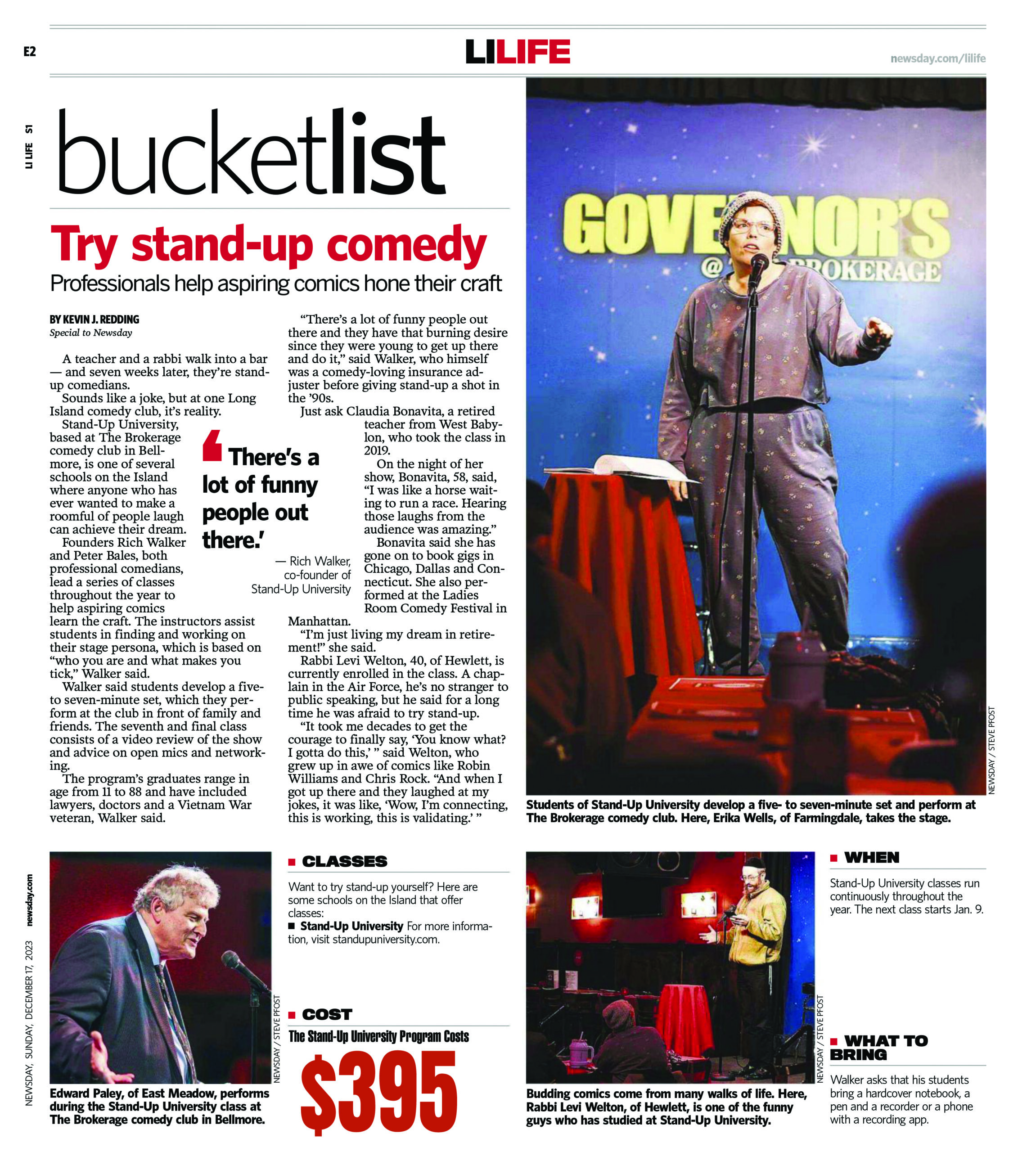 Stand-Up University is a first rate school instructed by Professional Comedians who teach the fine art of stand-up comedy. Over this seven week course students are encouraged to create and perform an original 5-8 minute routine which depicts the comical essence of whom they really are. Each week students get up on stage to work on their “act” with exercises designed to hone their comedic skills. On the 6th week students, now turned comedians, will actually perform in a real show at a Long Island Comedy Club.